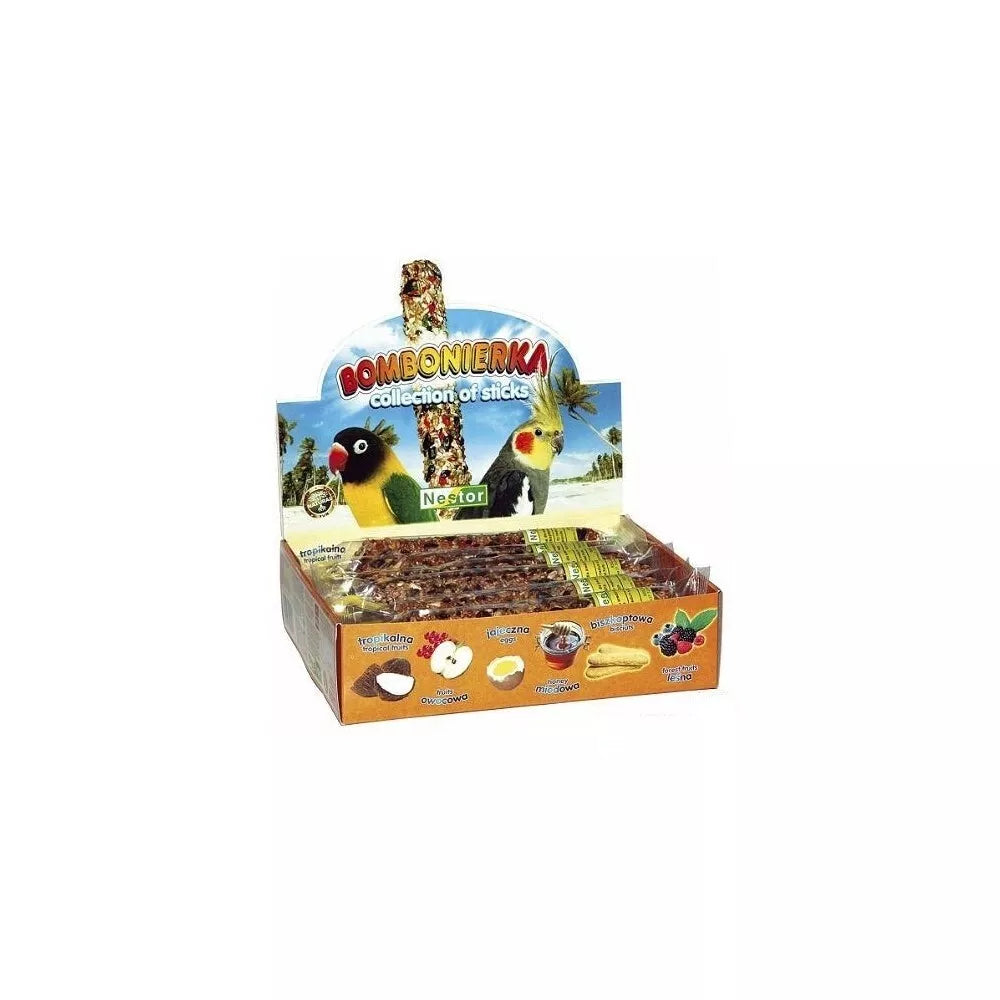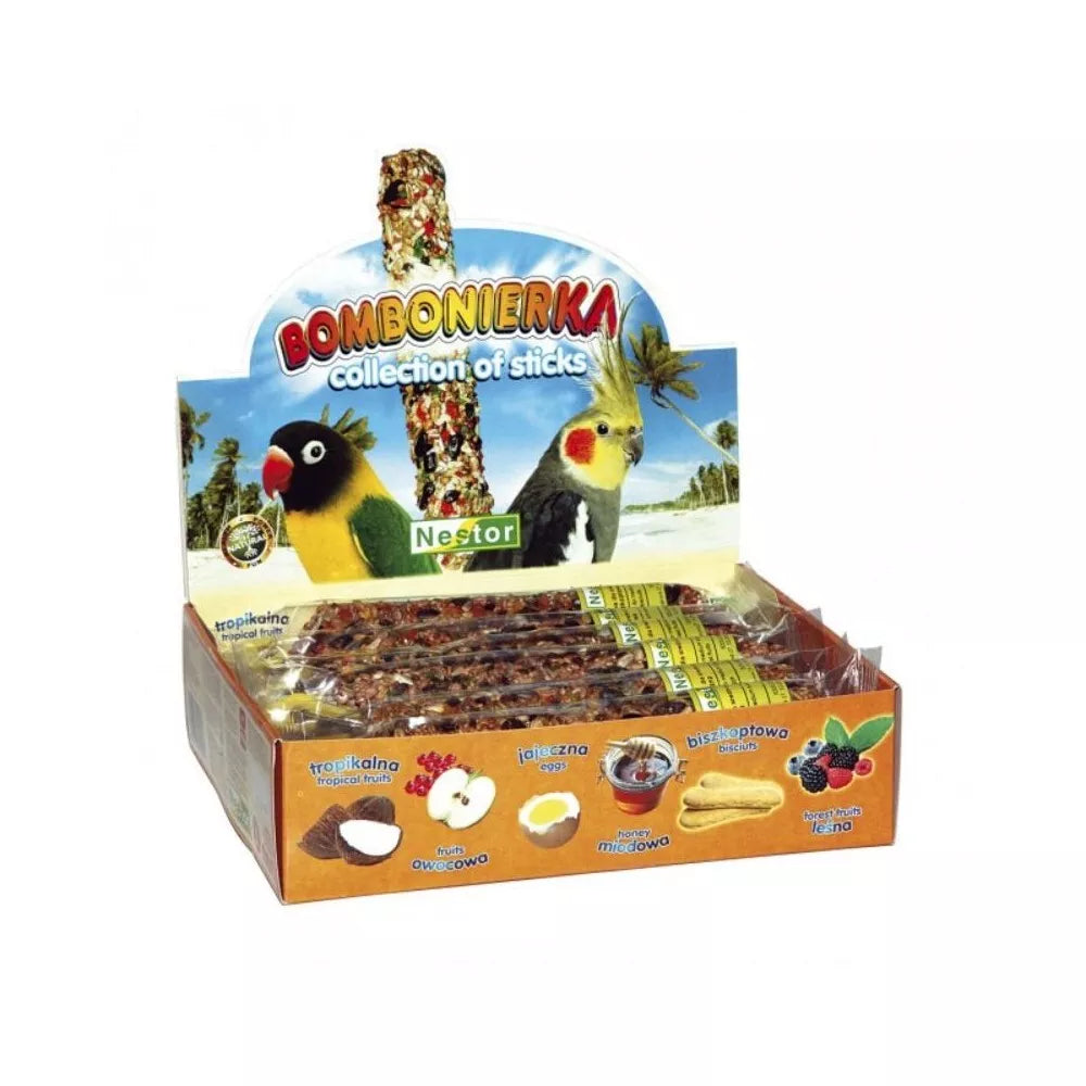 Ieškote būdo pradžiuginti savo vidutinę papūgą ir kartu papildyti jos mitybą vertingomis maistinėmis medžiagomis? Mūsų Bombonierka – tai unikalus 12 lazdelių formos skanėstų rinkinys, specialiai sukurtas jūsų augintinio gerovei ir pramogai. Kiekviena lazdelė – tai kruopščiai atrinktų ingredientų derinys, apimantis trapius biskvitus, maistingą kiaušinį, natūralų medų, gaivias miško uogas ir egzotiškus tropinius vaisius. Tai ne tik malonus užkandis, bet ir svarbus jūsų paukščio raciono papildymas vitaminais, mineralais bei mikroelementais, skatinantis jo gyvybingumą ir gerą savijautą. Unikali lazdelės forma ne tik suteikia ilgalaikę pramogą, bet ir padeda paukščiui natūraliai prižiūrėti savo snapą, valyti jį ir tuo pačiu pratintis prie elgesio, artimo gamtiniam.