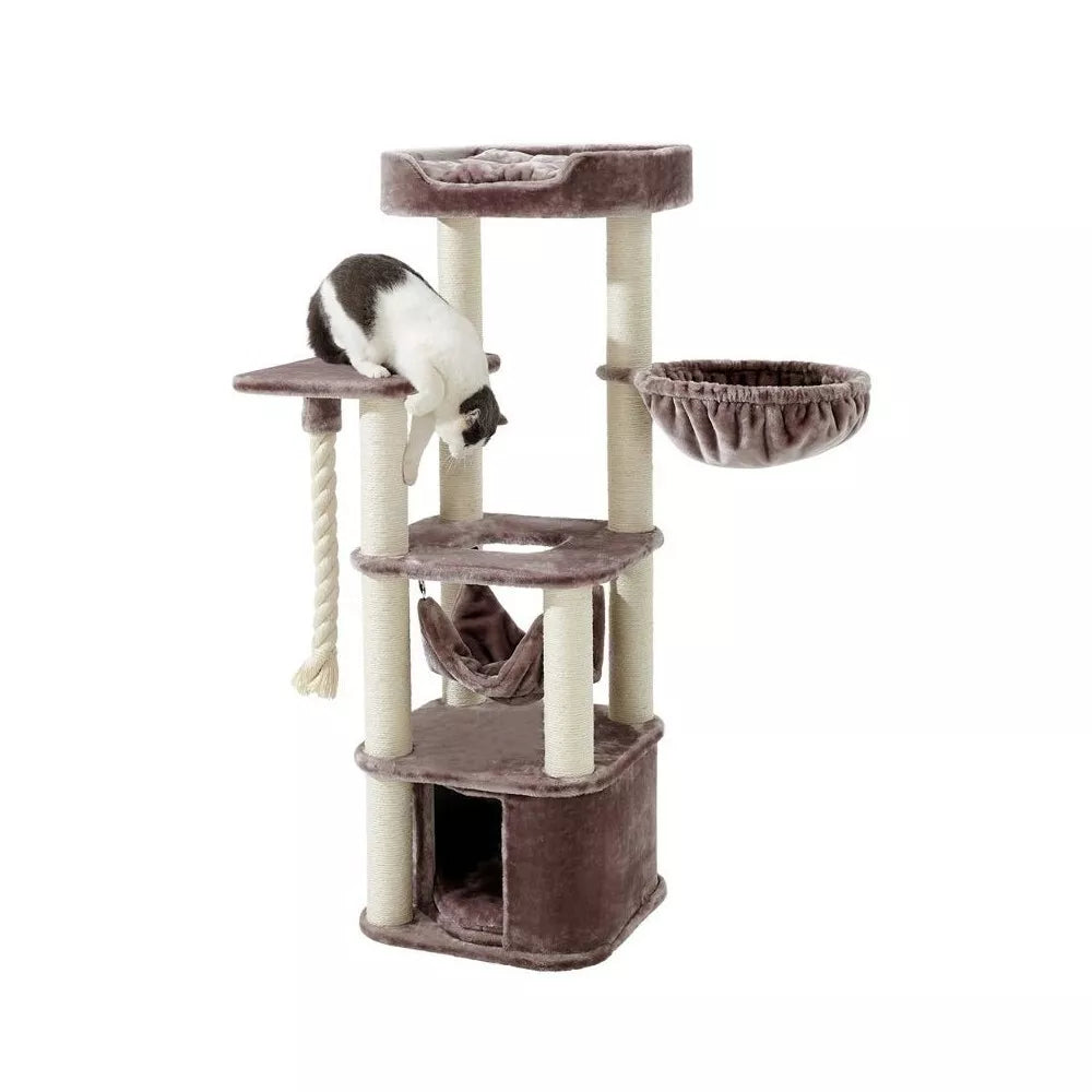 Apatinėje draskyklės dalyje įrengtas jaukus namelis – tai puiki vieta, kur jūsų katė gali pasislėpti, jaustis saugiai ir ramiai pabūti vienumoje. Kates dažnai vertina privačias, saugias erdves, kur jos gali miegoti, stebėti pasaulį pro mažą angą ar tiesiog ilsėtis ramiai, nejausdamos aplinkos trikdymų. Šis namelis suteikia būtent tokią apgalvotą erdvę. Draskyklės išmatavimai 50x50x145 cm užtikrina, kad ji bus stabili ir tinkama įvairaus dydžio katėms, siūlydama pakankamai erdvės tyrinėti ir ilsėtis.