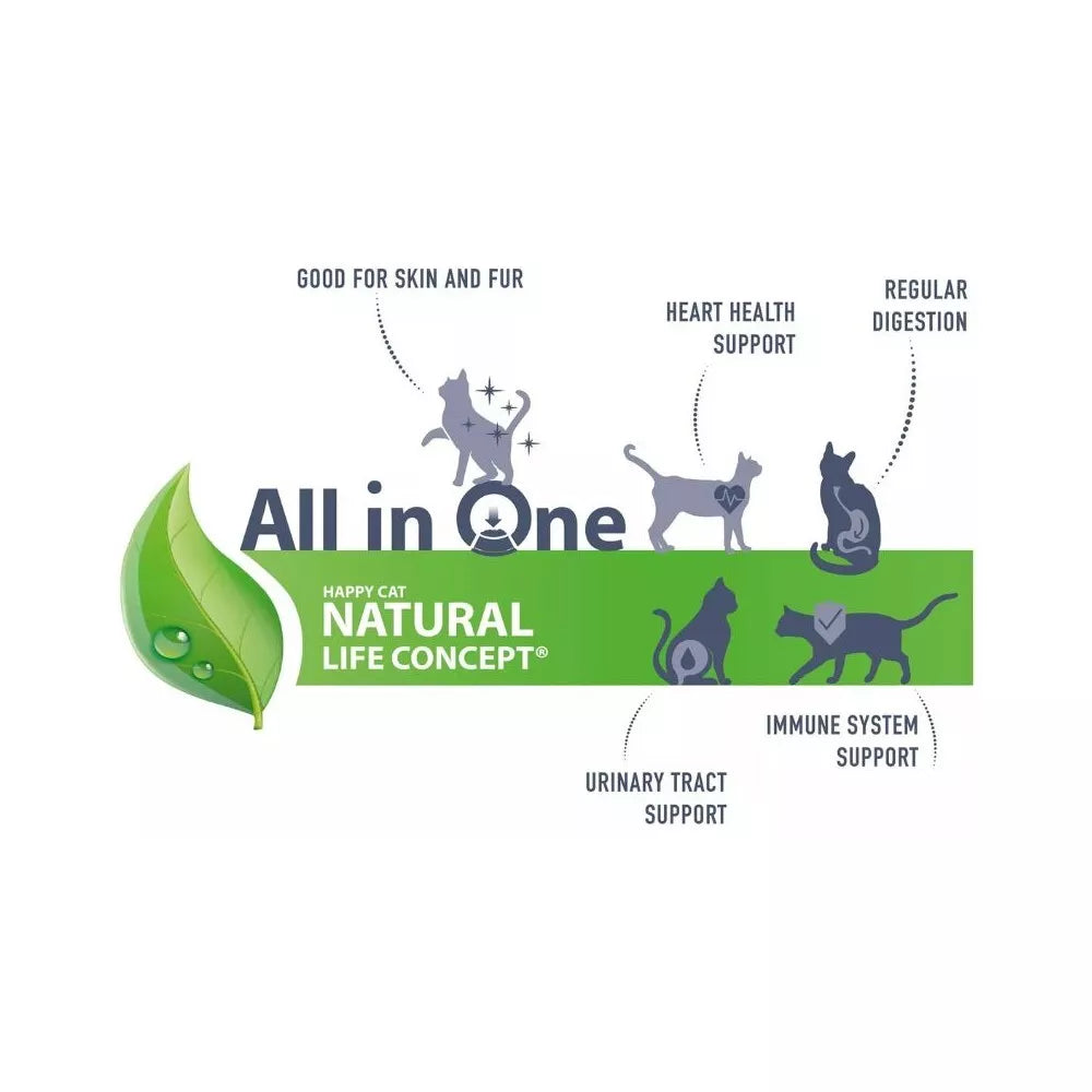 Visavertis pašaras suaugusioms katėms nuo 12 mėnesių amžiaus – tai "Happy Cat" įsipareigojimas aukščiausiai kokybei. Mūsų receptūra be grūdų yra specialiai sukurta siekiant užtikrinti optimalią mitybą ir išvengti galimų alerginių reakcijų. Pagrindą sudaro 30% paukštienos mėsos ir jos perdirbimo produktų bei 10% aukštos kokybės upėtakio. Papildyta augalinėmis skaidulomis, mineralais, linų sėmenimis ir inulinu, šiame maiste yra viskas, ko reikia jūsų katės gyvybingumui ir sveikatai kasdien.
