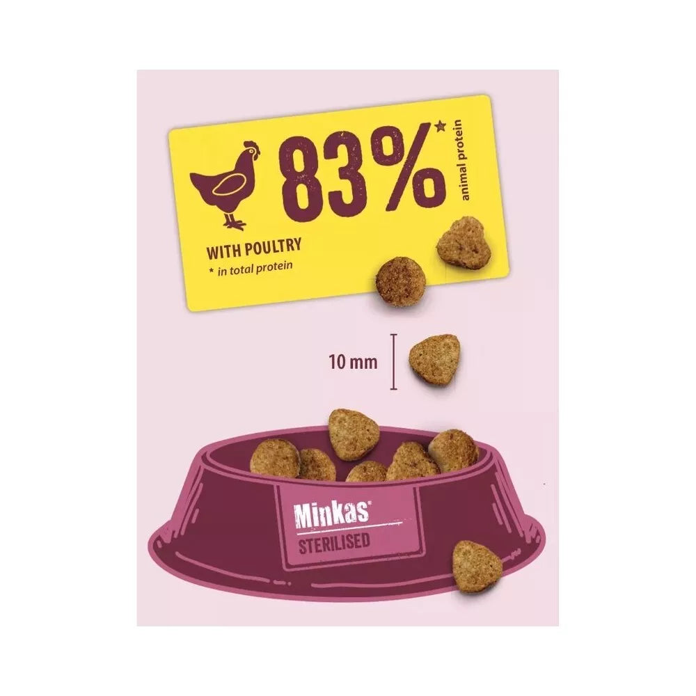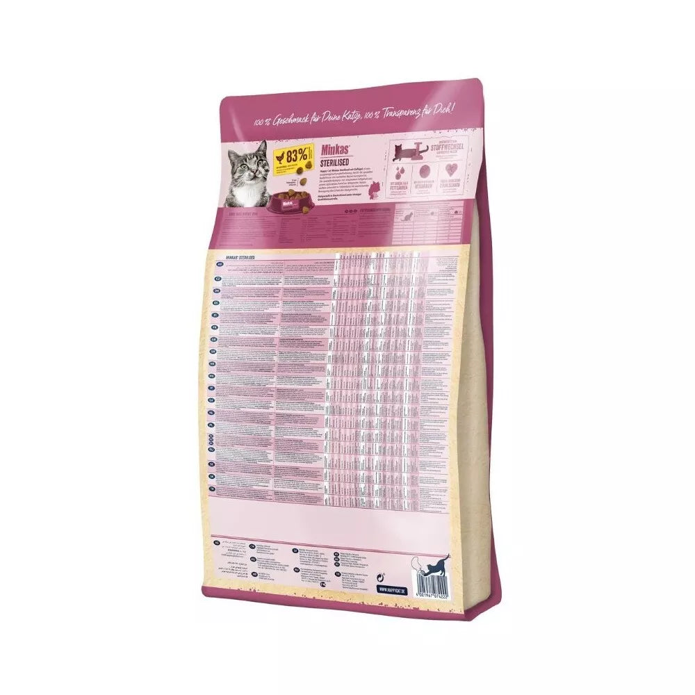 Sąžiningai atrinktos sudedamosios dalys sudaro Happy Cat Minkas Sterilized pašaro pagrindą. Tai paukštienos baltymai (25%), kukurūzai, mėsos miltai, kvietiniai miltai, kviečiai, kukurūzų miltai, lignoceliuliozė, žuvų miltai, paukštienos riebalai, cukrinių runkelių minkštimas, saulėgrąžų aliejus, obuolių išspaudos, natrio chloridas, kalio chloridas, rapsų aliejus ir Yucca shidigera (0,04%). Maistingumo analizė rodo: žali baltymai 33%, žali riebalai 9%, žalia ląsteliena 5%, žali pelenai 5,5%, kalcis 1,05%, fosforas 0,7%. Tokia sudėtis užtikrina visapusišką Jūsų augintinio gerovę.