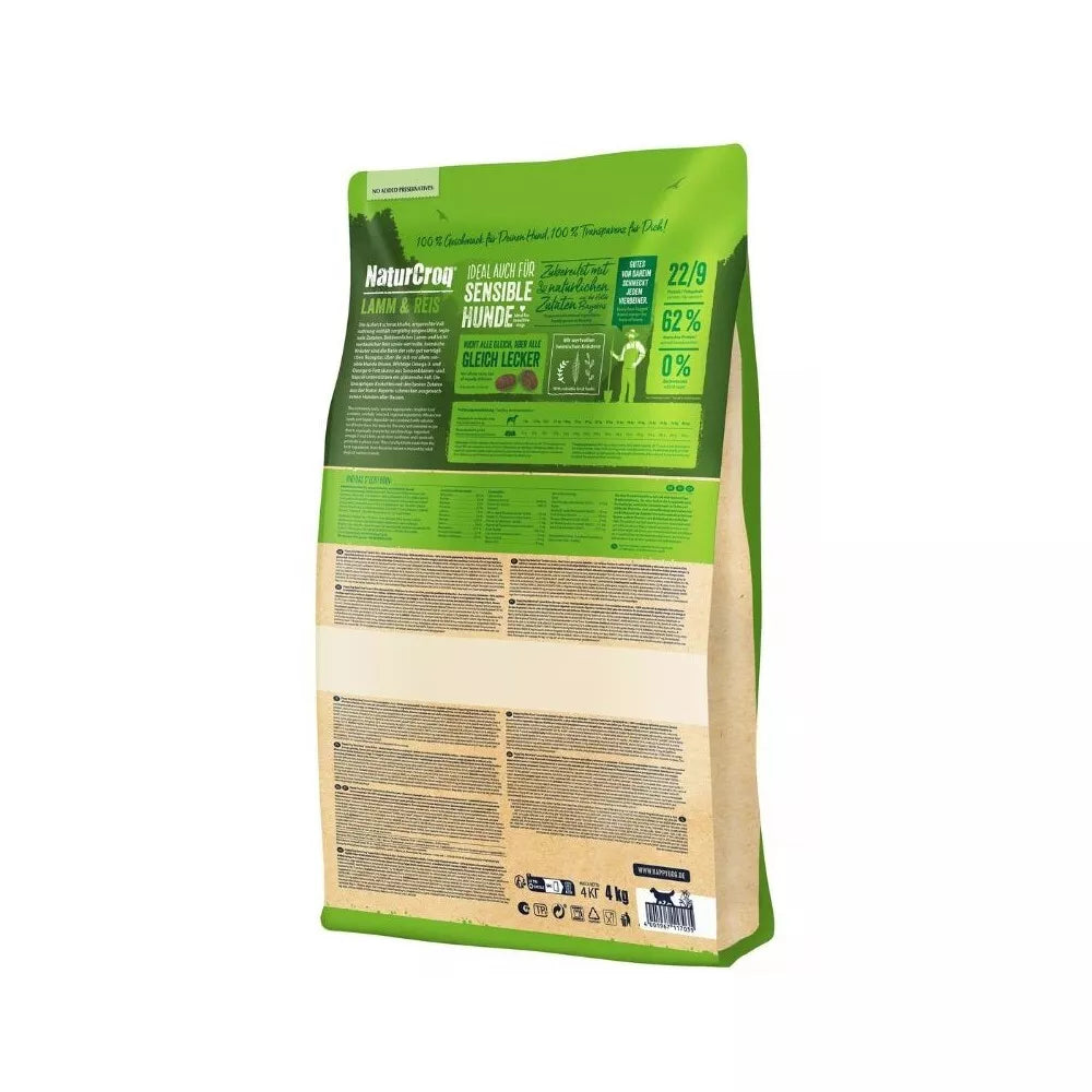 Happy Dog NaturCroq Lamm&Reis sukurtas atsižvelgiant į šunų mitybos poreikius. Jame esanti kokybiška ėriena (8,5%) ir ryžiai (8,5%) užtikrina puikų baltymų šaltinį, kuris yra lengvai įsisavinamas ir nedirgina virškinimo trakto. Maistas turi mažą riebalų kiekį, kas padeda palaikyti optimalų kūno svorį ir energijos lygį. Pilno grūdo kviečiai, kukurūzai ir miežiai suteikia ląstelienos ir energijos, o natūralūs aliejai (saulėgrąžų ir rapsų) papildo racioną Omega-6 riebalų rūgštimis. Papildomai įdėtos naudingos žolelės, tokios kaip avižos, saulėgrąžos, pipirnės ir petražolės, skatina virškinimą ir stiprina imuninę sistemą. Šis maistas yra 100% subalansuotas ir lengvai virškinamas.