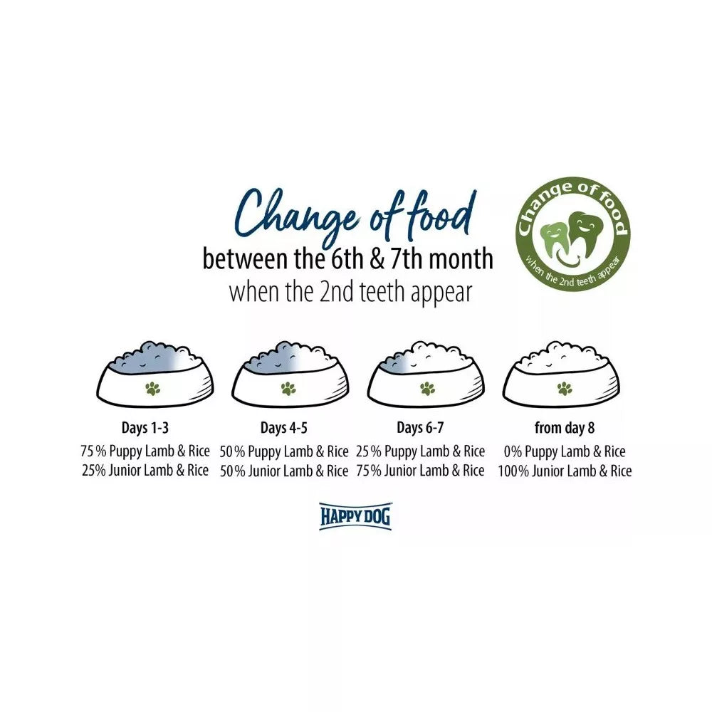 Amžius: Pašaras idealiai tinka šuniukams nuo 4 savaičių iki 6 mėnesių. Vėliau, nuo 7 mėnesių, rekomenduojama pereiti prie "Happy Dog Sensible Junior Lamb & Rice".