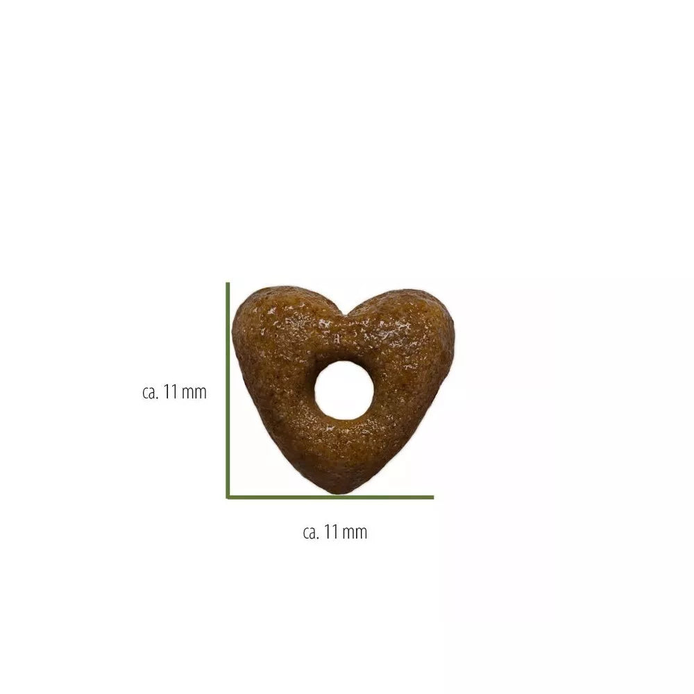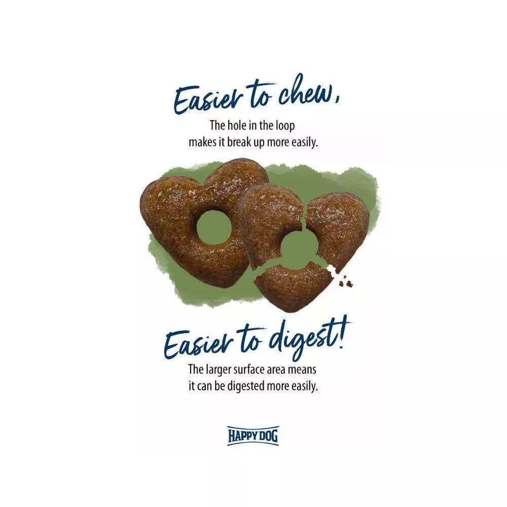 Kramtymo ir virškinimo patogumas – tai dar vienas "Happy Dog" rūpesčio jūsų augintiniu aspektas. Šio pašaro granulės yra specialios širdelės formos su skylute viduryje. Šis unikalus dizainas padeda granulėms greičiau suskilti burnoje ir skrandyje, palengvinant kramtymą ir žymiai pagerinant maistinių medžiagų įsisavinimą. Didesnis paviršiaus plotas leidžia virškinimo sultims lengviau pasiekti granulę, todėl maistas virškinamas efektyviau ir sumažėja virškinimo sistemos apkrova.