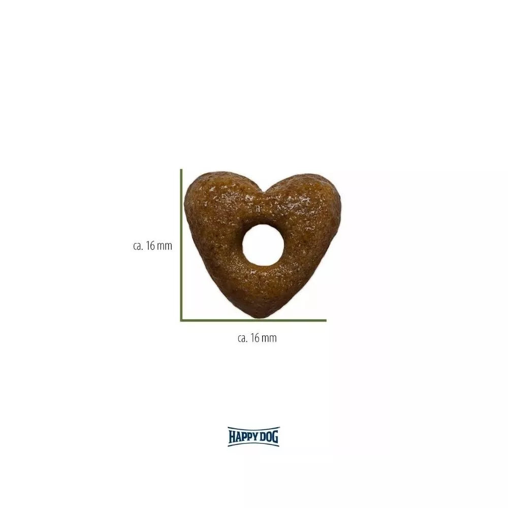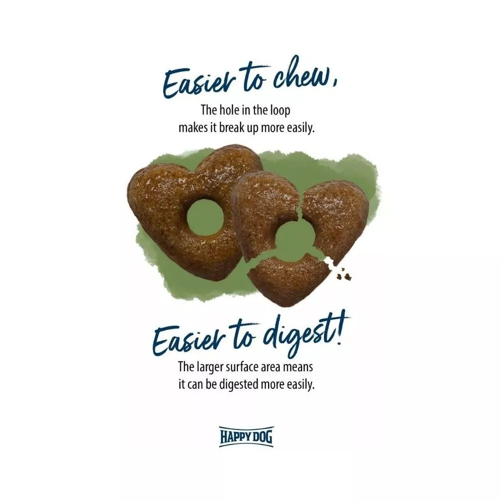 Happy Dog maisto gamyboje ypatingas dėmesys skiriamas ne tik sudėčiai, bet ir maisto pateikimo formai. Visi Happy Dog Junior produktai yra gaminami širdelės formos granulėmis su skylute viduryje. Toks dizainas nėra atsitiktinis – jis atlieka svarbią funkciją, užtikrinant optimalų maisto virškinimą. Skylutė granulės centre leidžia jai greičiau suskilti ir suirti jau kramtymo metu, taip palengvinant šuniui maisto kramtymą ir pirminį apdorojimą. Be to, didesnis granulės paviršiaus plotas leidžia virškinimo sultims geriau apsemti maistą skrandyje, todėl maistinės medžiagos įsisavinamos efektyviau. Tai garantuoja, kad jūsų augintinis gauna visą reikiamą naudą iš kiekvieno kąsnio.