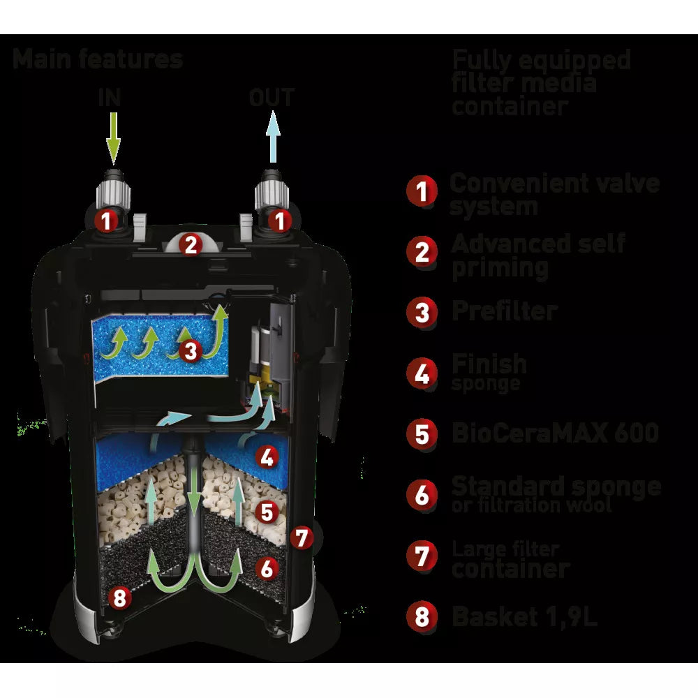 ULTRAMAX išorinis akvariumo filtras pasižymi itin didele talpa filtracinėms medžiagoms. Kiekvienas filtras turi kelis krepšelius, kurių kiekvienas talpina apie 1,9 litro filtravimo laikmenų. Tokia didelė talpa leidžia atlikti itin efektyvų mechaninį ir biologinį filtravimą. Standartinėje komplektacijoje rasite visus reikiamus užpildus: viršutiniame sluoksnyje – smulki kempinėlė, viduriniame – aukštos kokybės „BioCera Max 600“ keramika, o apatiniame – filtravimo vilna. Tokia medžiagų kombinacija užtikrina ne tik mechaninių nešvarumų sulaikymą, bet ir efektyvų kenksmingų azoto junginių skaidymą, palaikant stabilią ir sveiką akvariumo aplinką.