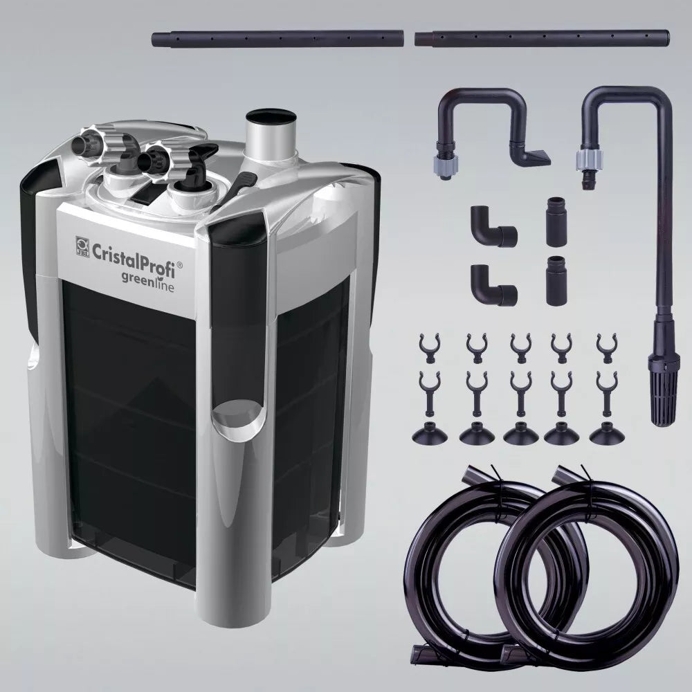 Užtikrinkite savo akvariumo gyventojams švarų ir sveiką aplinką su aukščiausios kokybės JBL CristalProfi® Greenline išoriniu filtru. Šis modelis – tai ne tik efektyvus sprendimas vandens filtravimui, bet ir paprastas naudoti įrenginys, sukurtas atsižvelgiant į šiuolaikinius akvariumininkų poreikius. Vanduo cirkuliuoja uždara sistema: siurblys, esantis filtro galvutėje, perima vandenį iš akvariumo, nukreipia jį per specialius filtracinius krepšelius nuo viršaus žemyn, kur jis kruopščiai išvalomas, ir švarus grąžinamas atgal į akvariumą. Nors filtras automatiškai neužsipildo vandeniu, pradinio oro pašalinimo procesas yra paprastas ir aiškus.