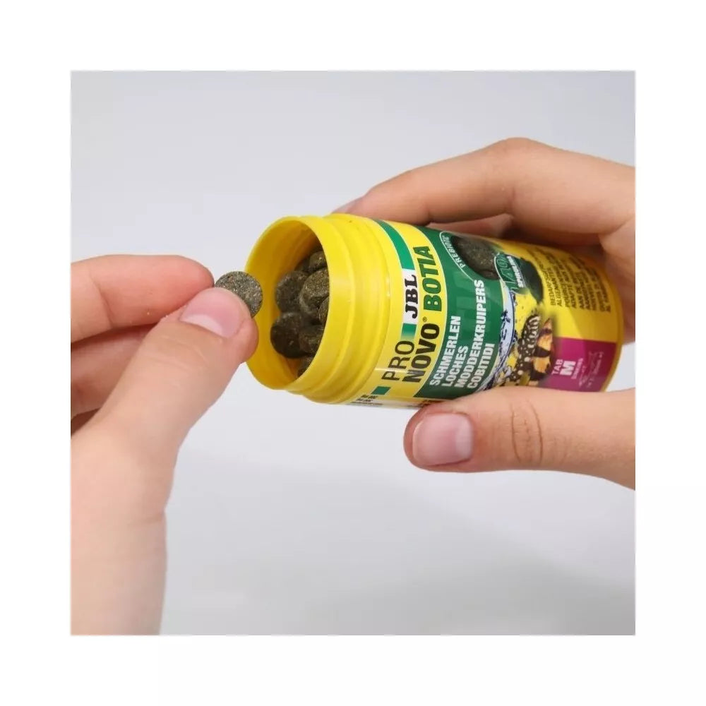 Rekomenduojama šerti JBL ProNovo Botia Tab M 1-2 kartus per dieną nedidelėmis porcijomis, kurias žuvys suėstų per kelias minutes. Toks maitinimo būdas padeda išvengti maisto likučių akvariume, išlaikant vandens kokybę. Šis pašaras yra visavertis ir praturtintas gyvybiškai svarbiais vitaminais (A, D3, E, C) ir mineralais, o jo sudėtis apima žalius baltymus (33%), žalius riebalus (6%), žalią ląstelieną (6%) ir žalius pelenus (8%). Dėl tokios subalansuotos sudėties Jūsų žuvys gaus viską, ko reikia sveikam gyvenimui.