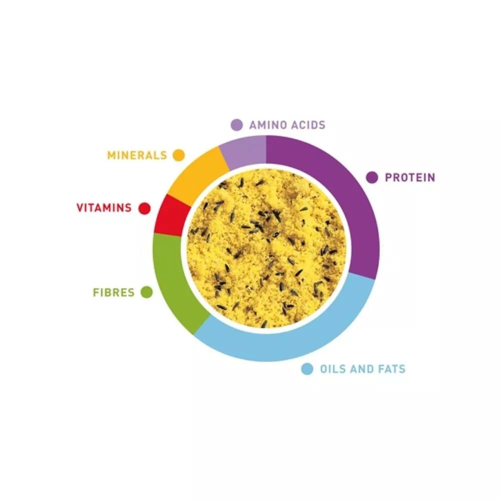 Ovomix Gold Giallo yra kruopščiai subalansuotas, siekiant užtikrinti optimalią paukščio mitybą. Jo sudėtyje rasite vertingų kepinių, maistingų aliejų ir riebalų, įvairių grūdų bei sėklų, suteikiančių energijos. Saldumynui ir apetitui skatinti pridedamas natūralus medus (1%) bei rinktiniai kiaušiniai ir jų produktai (4%), kurie yra puikus baltymų ir būtinųjų amino rūgščių šaltinis. Sorbitolis padeda palaikyti skysčių balansą, o augalinių baltymų ekstraktai ir vaisiai, tokie kaip obuoliai (0.5%), suteikia papildomų vitaminų ir antioksidantų.