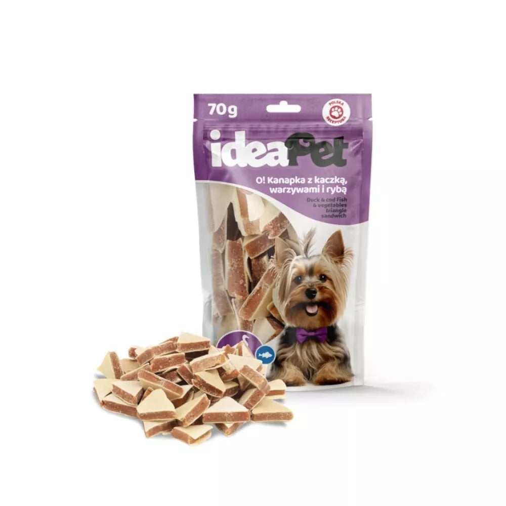 Skanėstas šunims: IdeaPet O! Trikampėliai su antiena, daržovėmis ir žuvimi (70 g)