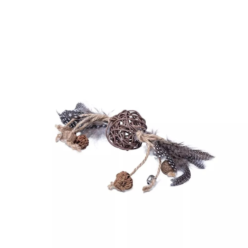 Šis žaislas yra daugiau nei paprastas kamuoliukas. Jis sukurtas stimuliuoti katės smalsumą ir norą persekioti. Lengvas, bet tvirtas kamuoliukas, papuoštas ilgomis, švelniomis plunksnomis, lengvai rieda ir šokinėja, imituodamas grobį. Kai tik jūsų katė palietžia žaislą, plunksnos sujudina, o viduje esantis nedidelis barškutis sukuria viliojantį garsą, kuris nepalieka abejingos nei vienos katės. Toks dizainas skatina fizinį aktyvumą, gerina judesių koordinaciją ir reakcijos greitį, tuo pačiu suteikdamas katytei saugų ir džiaugsmingą būdą išlieti energiją.